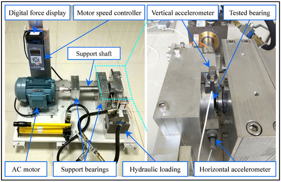 In this study, the public dataset of rolling bearings at Xi’an Jiaotong University (XJTU) was selected to verify the validity of the proposed MS-HDTEO method. The dataset is collected in the rolling-bearing accelerated life test platform shown in Figure 6, which consists of AC motors, motor speed controllers, rotating shafts, support bearings, a hydraulic loading system, and test bearings, etc. The platform can carry out accelerated life tests of various types of rolling bearings or plain bearings under different working conditions, and obtain a full life-cycle test dataset of the test bearings. For a detailed description of the platform, please refer to the following literature [25]. In the accelerated degradation test, three different operating conditions were set up, and five bearings were tested in each condition. The operating conditions included the following: (1) 2100 rpm (35 Hz) and 12 kN; (2) 2250 rpm (37.5 Hz) and 11 kN; and (3) 2400 rpm (40 Hz) and 10 kN. The vibration signals were generated by mounting the bearing housings in 90° positions, i.e., one was mounted on the horizontal axis and the other on the vertical axis. The sampling frequency was 25.6 kHz. A total of 32,768 data sets (1.28 s) were recorded for each sample, with a sampling period of one minute.