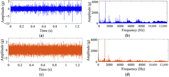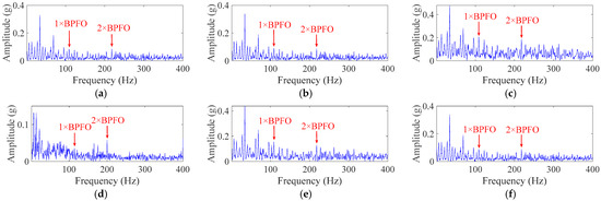 Frequency domain analysis of the bearing-vibration signals is an effective way to obtain information about the operating state of the machinery. The corresponding spectrum is obtained by FFT of the normalized time-domain vibration signal using Equation (6), where .