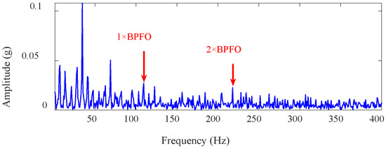Figure 8 shows the envelope spectrum corresponding to the fault signal of the outer race of the rolling bearing (in this paper, the amplitude of the envelope spectrum is normalized to [0, 1], and the display range of the frequency axis is set to [1, 400] Hz), from which it is not possible to accurately extract the outer-race fault characteristic frequency. It is necessary to filter it to reduce the irrelevant component interference and enhance the fault characteristics.