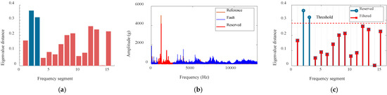 Figure 10a shows the eigenvalue distances of each frequency band calculated using the proposed method, and the results show that the fault-sensitive frequency bands 2 and 3 are effectively identified with significantly higher eigenvalue distances than the other frequency bands. Correspondingly, Figure 10b shows the spectrum difference between the fault and the reference signal, with the frequency range of [853.13, 1705.47] Hz for the selected band 2 and [1706.25, 2558.59] Hz for band 3. Figure 10c gives the determination of the optimal distance threshold of 0.2722 by calculating the mean and standard deviation of the eigenvalue distances, which achieves the precise localization of the fault-sensitive frequency band.