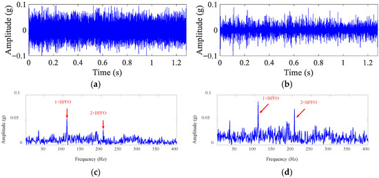 The experimental results obtained using the proposed method: (a) time-domain waveform of the fault signal after MSF; (b) time-domain waveform of the fault signal after MS-HDTEO; (c) envelope spectrum of the fault signal after MSF; (d) envelope spectrum of the fault signal after MS-HDTEO.