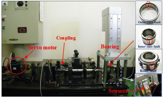 In the validation of the bearing public dataset, the vibration signals of the selected bearings exhibit early weak-fault characteristics. The weak-fault features exist not only in the early stage of the bearings, but also in the strong background noise, and the fault features will still behave weakly when disturbed by the strong background noise. To verify that the proposed MS-HDTEO can suppress the noise and extract the weak-fault features, a rotating mechanical equipment bearing-fault diagnosis test platform is constructed as shown in Figure 13, with a rotational speed of 1500 rpm. The main structural components include rotating motors, couplings, bearings, rotors, etc. The testbed is deployed with adjustable-speed rotary motors, couplings, bearings, rotors, and so on. The test platform deploys an adjustable-speed rotating motor that generates wideband mechanical noise, due to unbalanced vibration transmitted by a rigidly connected coupling. To test the single point of fault of the bearings, square grooves are machined on the outer race, inner race, and roller, using wire-cutting technology.