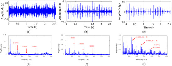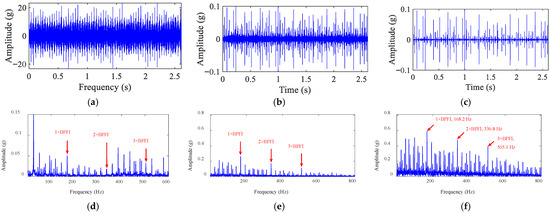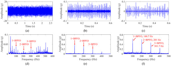 Based on the experimental results of the above intermediate process, the IFFT is performed on the filtered spectrum to reconstruct the time-domain signal, and then the envelope spectral analysis is carried out to extract the outer-race fault characteristic frequency. A segment of the signal from 0–0.6 s was extracted for visualization. Figure 16a presents the outer-race fault vibration signal collected based on the bearing test platform, in which the fault impulse is overwhelmed by the strong background noise. Figure 16d shows the corresponding envelope spectrum, in which the fault characteristics are weak and there are a large number of irrelevant components interfering near the characteristic frequency of the outer-race fault, which leads to the inability to accurately identify the type of bearing fault. Figure 16c demonstrates the filtered signal after HDTEO processing, and, compared with the signal without HDTEO processing in Figure 16b, the background noise is significantly suppressed, the SNR is improved, and the fault impulse characteristics are visible. Correspondingly, in the envelope spectrum shown in Figure 16f, the amplitude of the characteristic frequency component of the outer-race fault and its harmonic components is significantly higher than that of the background noise component. Using the method proposed in this paper, the outer-race fault characteristic frequency extracted from the envelope spectrum is close to the theoretical value, which can be accurately judged as the outer-race fault.