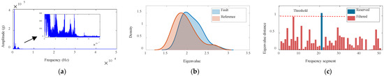 Frequency band and characterization of the signal: (a) inner-race fault signal spectrum; (b) frequency band eigenvalue probability density; (c) distance threshold to locate the fault-sensitive frequency band.