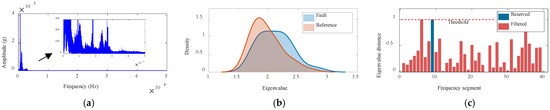 Figure 15a shows the spectrum of the fault signal, which is less different from the spectrum of the reference signal demonstrated in Figure 14b. The probability density analysis is performed by extracting the first eigenvalue of the multivariate matrix, which combines the multidimensional features of the fault and the reference signal. The probability density curves shown in Figure 15b show that the first eigenvalue of the frequency bands of the fault and the reference signal are significantly different. Figure 15c shows that the distance threshold of the eigenvalues determined based on the proposed method is 1.05. The filtering results in a fault-sensitive frequency band of 56, with a frequency center of 42,681.69 Hz and a frequency range of [42,297.36, 43,066.02] Hz.