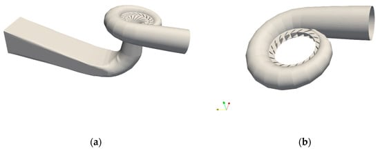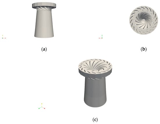 The volute is replaced by a custom boundary condition. This is imposed on an artificial plane positioned at the runner’s inlet. On this surface, a vector velocity field is imposed using the codedFixedValue condition, configured to generate a set of vectors radially oriented toward the runner’s axis, with an adjusted inclination to represent the inflow pattern that would be induced by the actual spiral casing. This synthetic field reproduces the momentum and general direction of the incoming flow without requiring resolution of the internal geometry of the volute [32]. In Figure 1, the geometry of the Francis turbine is presented with the component that will be removed (volute).