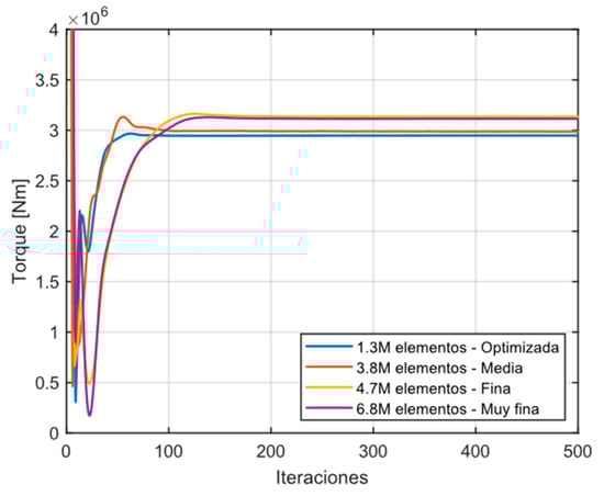 This will be determined by calculating the torque exerted on the turbine’s moving blades at the point where the calculated values reach stability, using the SIMPLE algorithm. These data will make it possible to determine whether the predictions obtained through numerical simulation are independent of the number of mesh elements used.