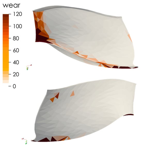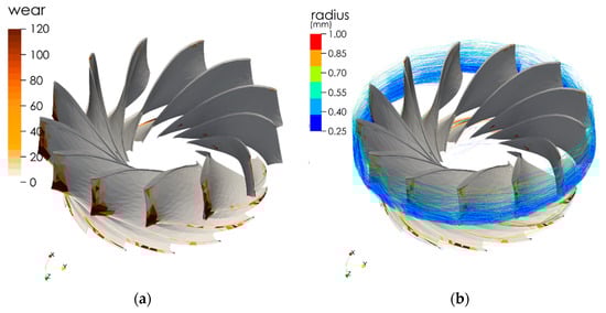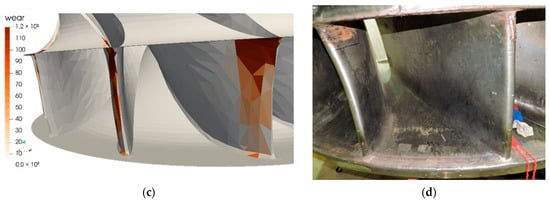 The erosion maps on the guide vanes (Figure 6) and the runner (Figure 7) show that the highest material loss is concentrated at the trailing edges of the blades. In particular, significant wear is observed on the rear face and trailing edges near the crown and band ring. This distribution is explained by the acceleration of the flow and the orientation of the particle trajectories, which direct the particles toward these surfaces with angles close to a normal incidence.