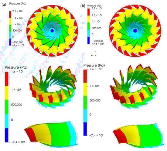 One of the initial methodological decisions evaluated was the simplification of the geometric domain. By comparing the simulation that includes the spiral casing, guide vanes, runner, and draft tube with a reduced domain consisting only of the guide vanes, runner, and a portion of the outlet tube (Figure 5), it was observed that the pressure distributions on the runner were virtually identical. This equivalence validates the use of the reduced domain for particle impact studies. It significantly reduces computational requirements while maintaining the accuracy of the pressure field and facilitates parametric simulations at lower operational costs.