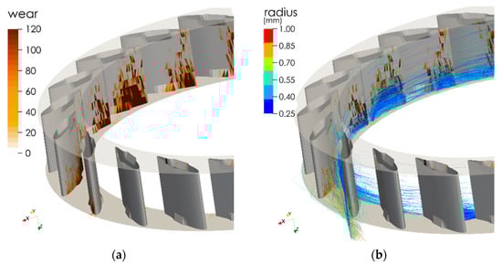 The particle trajectories, overlaid in the figures, clearly demonstrate spatial coincidence between regions of high impact density and areas of greatest erosion. This correlation validates the accuracy of the developed Lagrangian method and supports the use of the Oka model in hydro-turbomachinery contexts.