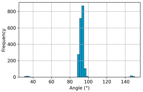 The impact angle distribution (Figure 9) shows a peak around 92°, indicating a predominance of almost perpendicular impacts. This type of collision generates greater wear in medium-hardness metals commonly used in hydraulic components, as determined by Oka et al. [10]. Perpendicular impacts tend to produce micro-cutting, surface micro-fracture, and localized material removal [10].