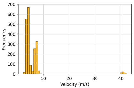 Figure 10 shows the histogram of impact velocities for solid particles recorded in the CFD–Lagrangian simulation of internal flow through a Francis turbine. Most impacts occurred at velocities between 5 and 10 m/s, with a frequency peak around 5 m/s, typical conditions for sediment transport in moderate-flow regions of the runner or guide vanes.