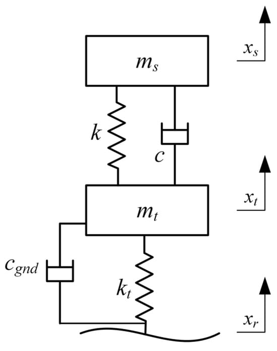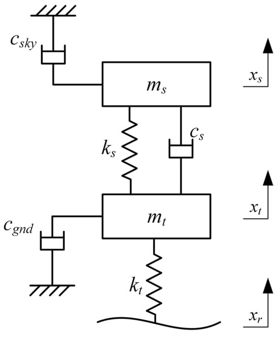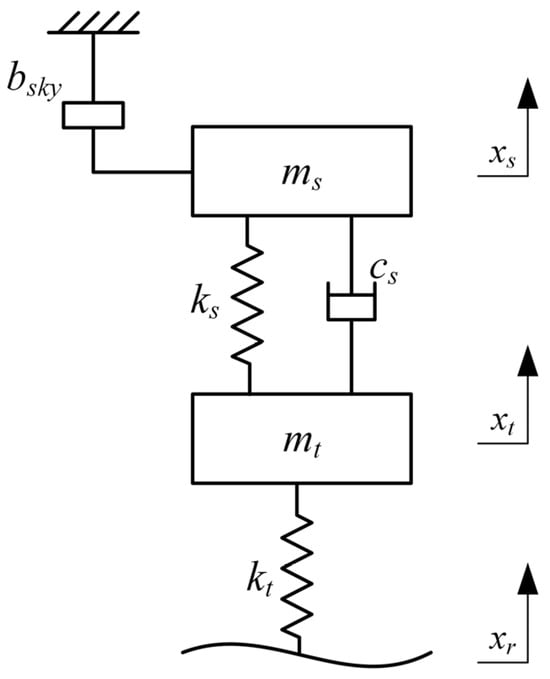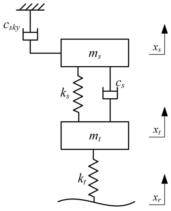 where ms is the sprung mass, mt is the unsprung mass, k is the equivalent stiffness of the suspension system, c is the damping coefficient of the suspension system, kt is the equivalent stiffness of the wheel, xs is the absolute displacement of the vehicle body, xt is the absolute displacement of the wheel, xr is the road excitation, and csky is the Skyhook damping coefficient.