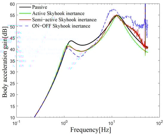 The 2-DOF semi-active suspension system body acceleration response in frequency domain. Reproduced with permission from [42].