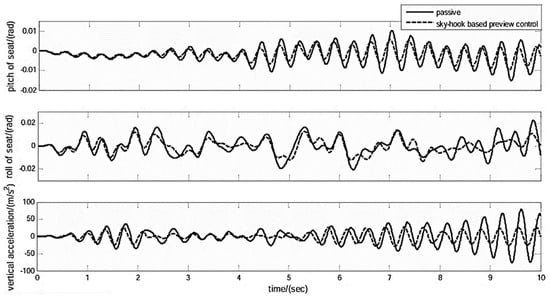 Research on traditional Skyhook-based control primarily focuses on how to use the sprung mass state (velocity and acceleration) to design the damping coefficient. Although these control methods have the advantages of simple calculation and easy implementation, the improvement in ride comfort is limited. Therefore, scholars have proposed many improved control algorithms based on the traditional Skyhook theory. For example, Yi et al. proposed a novel adaptive Skyhook damping control law and studied its impact on suspension performance [31]. To further enhance vehicle ride comfort, some scholars have integrated road preview systems with Skyhook damping control; for example, Song et al. designed Skyhook-based preview control; simulation results for a seat under different controls are shown in Figure 4 [32]. The simulation results show that Skyhook-based preview control can achieve significantly better ride comfort.