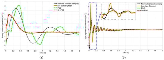 In addition to the research on preview control, studies on suspension control algorithms from the perspective of energy transfer have also made progress. Liu et al. analyze the abilities of vehicular suspension components—the shock absorber and the spring—from the perspective of energy transfer between the sprung mass and the unsprung mass [33]. They propose a new sprung mass control algorithm named mixed Skyhook and power-driven damper (SH-PDD); the response under initial condition excitation is shown in Figure 5. It can be seen that the shock tests show that SH-PDD always performs better than SH and PDD across the whole frequency spectrum.
