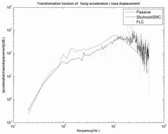 In addition to combining Skyhook control with distributed control, researchers have also focused on integrating Skyhook control with sliding mode control (SMC) to further optimize semi-active suspension systems and enhance ride comfort [40]. For example, Qiang Chen et al. proposed a new SH-SMC control method for semi-active seat suspension and carried out experimental verification [41]. Yi Chen designed the Skyhook-SMC damping controller and compared it with a fuzzy logic controller (FLC) and passive suspension. The result is shown in Figure 7 [42].