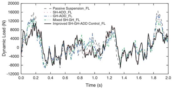 Figure 12 shows the dynamic load of the right front tire, it can be seen from Figure 12 that the root mean square value of the tire dynamic load under various control strategies is improved compared with that of passive suspension, and SH-GH-ADD greatly improves the tire dynamic load of the right front tire.
