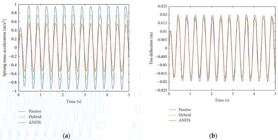 Graphs of responses under sine wave function road model. (a) Sprung mass acceleration; (b) tire deflection. Reproduced with permission from [75].