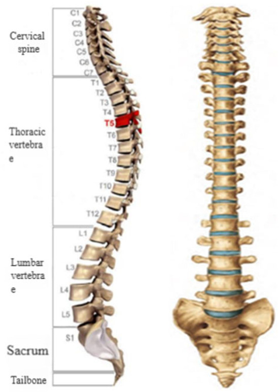 Based on the curvature and morphology of the relevant vertebrae, the spine is subdivided into four regions: the cervical spine, thoracic spine, lumbar spine, and sacrum [18]. The movement of the lumbar spine is generated by the combined action of the five lumbar vertebrae and intervertebral discs, which form multiple lumbar segments, along with the surrounding muscle groups and nerves in the lumbosacral region. Figure 1 shows the human spine and lumbar spine.