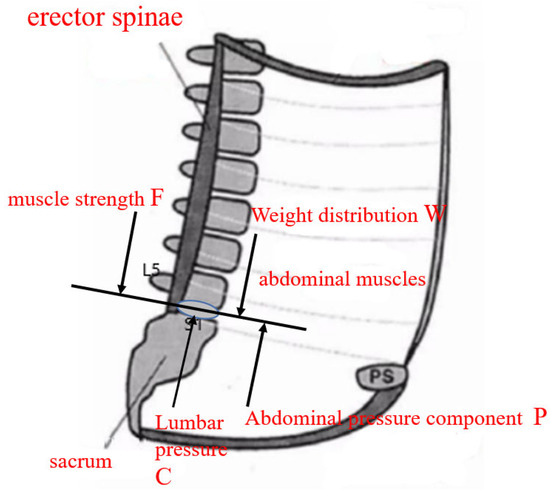 The analysis of lumbar spine loading is shown in Figure 2. The pressure C acting on the L5/S1 intervertebral disc increases with the increase in muscle force F and the vertical downward force W of the upper body weight. Additionally, the abdominal pressure component P helps reduce the pressure on the intervertebral disc, with force P originating from the increase in abdominal pressure. Intra-abdominal pressure is caused by the concentric contraction of the diaphragm, pelvic floor, and muscles surrounding the abdominal cavity. One of its longitudinal components reduces the value of lumbar pressure C.