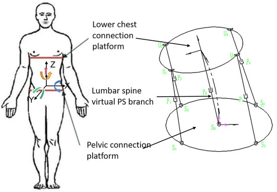 Based on the motion analysis of the human lumbar spine, lumbar motion can be abstracted as a joint composed of a ball joint and a sliding joint. A 4-SPU/SP parallel mechanism, consisting of four SPU branches composed of a ball joint S, a sliding joint P, a Hooke joint U, and one SP branch mimicking the human lumbar spine, is used to mimic lumbar motion, as shown in Figure 3. The parallel mechanism has four degrees of freedom, enabling three-axis rotation around the coronal, sagittal, and vertical axes, as well as movement along the z-axis. This allows the lumbar spine to perform flexion and extension, lateral bending, and vertical rotation and to slightly extend longitudinally under traction. The upper platform of the parallel biomimetic mechanism is fixed to the ribs via flexible straps, while the lower platform is fixed to the human pelvis via flexible straps. Four miniature electric actuators drive the parallel mechanism to support the weight of the human upper body, thereby relieving lumbar spine pressure and providing programmable corrective support torque that can be controlled over time and position. This biomimetic design allows patients to wear the device comfortably, enabling free movement without affecting daily activities. It also enables active rehabilitation training of lumbar muscles through three rotational movements, thereby enhancing lumbar spine stability.