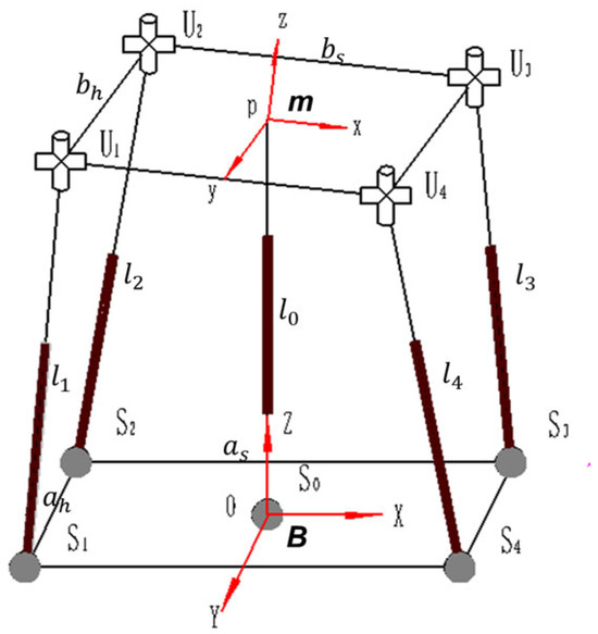where M represents the degree of freedom of the mechanism; d represents the order of the mechanism, d = 6 − λ; λ represents the number of public constraints; n denotes the number of components including the frame; g denotes the number of moving joints; and indicates the number of degrees of freedom for the i-th kinematic pair. indicates the number of redundant constraints in a multi-ring parallel mechanism after removing common constraints, and ζ represents the local degree of freedom existing in the mechanism. In the 4-SPU/SP BPM, the common constraint is 0, the mechanism order is d = 6, and the number of components is n = 11. It has 4 universal pairs, 5 ball pairs and 5 moving pairs, g = 14, Redundancy constraint v = 0, and there is no local degree of freedom for the ups drive branch chain and SP driven branch chain, ζ = 0. Substituting the analyzed data into Formula (2) yields