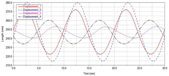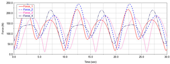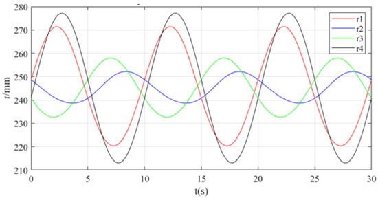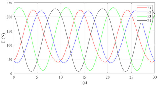 By estimating the maximum angular acceleration of each driving branch as 0.002 m/s2 using the above Equation (43), the variation curves of driving force for each driving branch over time can be obtained as shown in Figure 13. It can be seen from the figure that the theoretical maximum driving force required for each drive motor is 245 N, which can be used as a reference for the selection of electric pushrods in the structural design.