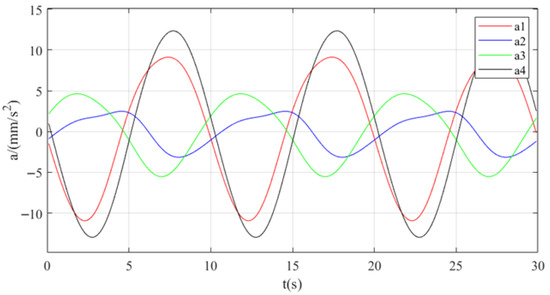In the equation, JD is a 4 × 4 velocity Jacobian matrix, and Formula (24) is the mapping model from end-independent velocity to drive velocity. Combining Equations (21) and (22), the linear and angular accelerations of the moving platform in the 4-SPU/SP bionic parallel mechanism can be derived as follows (detailed expressions are provided in Ref. [28]):