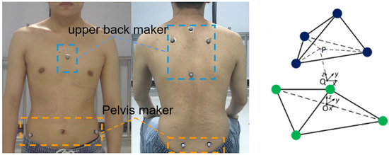 To design a mechanical structure matching lumbar movements, it is necessary to analyze the natural movements of the human lumbar region and determine its maximum daily range of motion. This study uses a 3D motion capture system (Motion Capture Systems) equipped with 6 cameras from Qualisys (Sweden) to collect experimental data from a healthy male volunteer (height 175 cm, weight 70 kg) in the laboratory. Infrared reflective markers are placed on the subject’s anterior superior iliac spine, sacrum, sternoclavicular joint, and upper back. In the Motion Capture Systems interface, corresponding marker points are selected to construct rigid bodies for the pelvis and torso and establish corresponding coordinate systems. Considering occlusion, 4 torso markers are selected based on practical conditions to record their relative movements, as shown in Figure 14. The subject is required to perform lumbar movements at self-paced speeds in three anatomical planes (lateral flexion in the coronal plane, flexion–extension in the sagittal plane, and rotation in the transverse plane), moving the torso to the limit position as much as possible. Each action is repeated three times consecutively, and the range of motion of lumbar movements is calculated by reconstructing marker trajectories through the 3D motion capture system.