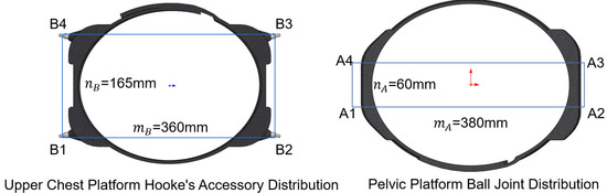 The LRFE is designed with an upper and lower double-ring support structure. The upper ring fits and binds to the lower edge of the human ribs and can be regarded as the moving platform of the parallel mechanism. The lower ring fits and binds to the human hip bone and can be regarded as the fixed platform of the parallel mechanism. With reference to the body dimensions of Chinese adults, in this paper, the length of the rectangle where the Hooke hinges of the upper thoracic platform are distributed is set as 36 cm, and the width is set as 16.5 cm; the length of the rectangle where the spherical joints of the pelvic platform are distributed is set as 38 cm, and the width is set as 6 cm; and when the human body maintains an upright posture, the height h between the upper thoracic platform and the pelvic platform is set as 22 cm, as shown in Figure 15.