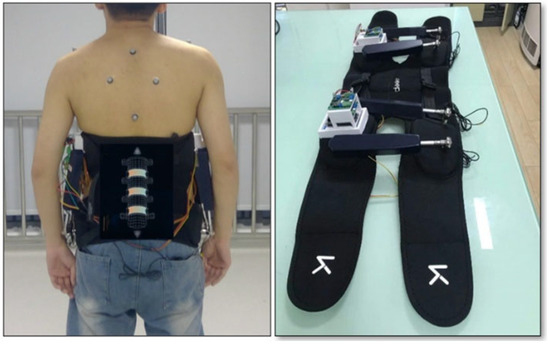 With the rapid development of intelligent robot technology, numerous robot assisted systems have been applied in the field of medical rehabilitation. For example, ReWalk (Yokneam Ilit, Israel) and Ekso [3] from the United States, Locomat from Hocoma AG in Volketswil, Switzerland [4], and RUBERT [5] developed by Arizona State University are typical lower or upper limb exoskeleton rehabilitation robots that mainly provide support and training functions for the limbs [6]. In addition, Stefano et al. from the Italian Institute of Advanced Robotics Technology have developed a lumbar exoskeleton for assisting manual operation [7], which uses motor-driven actuators for active support and proposes a design method for parallel elastic actuators to adapt to asymmetric torque output required for different tasks [8]. The SPEXOR project, funded by the European Union, has developed a passive flexible lumbar exoskeleton for the prevention of lower back pain [9]. Hara and Sankai from Tsukuba University in Japan designed the lumbar support assist device HAL, which effectively reduces the burden on the waist [10,11]. The AWN-03 [12] launched by Panasonic adopts a small high-power motor and a compact gear transmission structure, and it uses carbon fiber and resin materials to reduce equipment weight [13]. The hydraulic lumbar traction device manufactured by Zhejiang Bo’an Medical Devices Technology Co., Ltd. (Hangzhou, China) in China is used for lumbar decompression therapy [14]. The Muxin Du team designed a lower limb rehabilitation robot with an assisted standing function [15], and the Lisheng Wang team combined expansion and contraction PAM to develop a soft actuator for lumbar support, effectively reducing lumbar compression force [16]. Despite the continuous advancement of related research, the current active exoskeleton system for lumbar rehabilitation is still relatively limited. Existing commercially available products, such as the portable pneumatic traction device Disk Dr. from Changrui Medical in South Korea and the hydraulic lumbar traction device from Boan Medical in China [17], respectively, achieve lumbar decompression through abdominal pressure or hydraulic support, but the auxiliary effect is weak or the support method is single in nature. In contrast, although large lumbar traction devices used in clinical practice have significant therapeutic effects, they are not suitable for home use due to their large size, high cost, and complex operation.