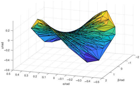 By using the forward kinematic model, the pose of the moving platform can be obtained by giving the rod lengths of the parallel mechanism. When the moving platform is at the boundary of the reachable workspace, the angles of each axis of the moving platform coordinate system relative to the fixed platform coordinate system are recorded. MATLAB can be used to plot the posture angle distribution of the moving platform of the parallel mechanism, as shown in Figure 19. Through the 3D motion capture system, we found that the daily motion range of the human lumbar region is as follows: forward flexion of about 60°, backward extension of about 15°, left/right lateral flexion of about 30°, and left/right rotation of about 20°. That is, the posture angle range of the moving platform of the bionic parallel mechanism is as follows: −30° ≤ α ≤ 30°, −15° ≤ β ≤ 60°, −20° ≤ γ ≤ 20°, according to the longitudinal change of the lumbar spine in hospital traction equipment (about 2 to 3 cm), i.e., 210 ≤ p, z ≤ 240 mm. From the posture angle distribution of the bionic parallel mechanism in Figure 20, the reachable motion range of the mechanism is obtained as follows: maximum flexion/extension of 85.9° around the x-axis, maximum bending of 33.2° around the y-axis, and maximum rotation of 25.7° around the z-axis. It can be concluded that the workspace of the 4-SPU/SP bionic parallel mechanism designed in this paper can fully cover the daily maximum range of motion requirements of the LRFE.