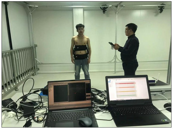 First, a calibration wand was used to dynamically calibrate the 3D motion capture system. After calibration, the subject with reflective markers attached entered the capture space. In the Motion Capture Systems interface, corresponding markers were selected to construct rigid bodies for the pelvis and trunk, and relevant coordinate systems were established to enable real-time dynamic capture of lumbar motion angles. The tester was required to move the trunk as far as possible in the coronal (lateral bending), sagittal (forward/backward flexion), and transverse (rotation) planes both with and without wearing the LRFE. Six cameras performed real-time dynamic capture, as shown in Figure 21. The built-in software of Qualisys recorded and processed the data. The experimental results are presented in Table 6.