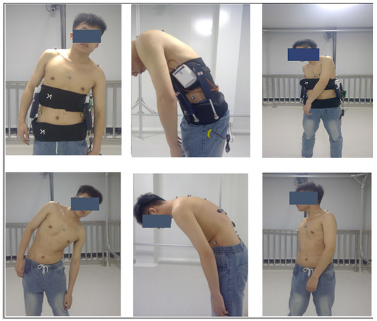 This section conducts a maximum range of motion test on trunk movement while wearing the LRFE prototype to verify the practical feasibility of the bionic mechanism workspace design. The experimental platform for the LRFE prototype is built as shown in Figure 20, including the LRFE prototype, Motion Capture Systems (3D motion capture system) from Qualisys AB, Göteborg, Sweden, and a host laptop computer. A healthy young adult male subject, aged 26 years and 1.75 m in height, was recruited for the experiment. The experiment measured the maximum feasible range of trunk movement with and without an exoskeleton. A 3D motion capture system was used to record trunk movement, with reflective markers placed on the iliac crest, sacrum, sternoclavicular joint, and lower edge of the sternum of the test subjects.