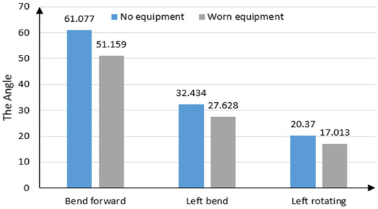 Experimental Results: As shown in Table 6, which presents the test data for forward flexion, left lateral flexion, and left rotation with and without wearing the LRFE, the maximum forward flexion angle is 61°, lateral flexion is 32°, and left rotation is 20° without the exoskeleton, which is consistent with the results of the daily motion range test for the human lumbar region. When wearing the exoskeleton, the range of motion is restricted, and the data are compared in a bar chart as shown in Figure 22. Calculating the percentage of the subject’s motion range with the exoskeleton relative to that without the exoskeleton, the forward flexion reaches approximately 83.7% of the bending angle without equipment, the left lateral flexion reaches approximately 85.2%, and the left rotation reaches approximately 83.5%. It can be seen that the LRFE prototype basically meets the designed workspace of the mechanism, ensuring the lumbar motion range for daily human activities.