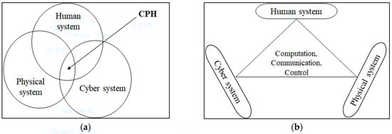 As Figure 1b shows, the CPH framework needs to perform computation, communication, and control within the cyber, physical, and human systems to function properly [,]. There are communications along three directions: (i) communications between the cyber system and the physical system, (ii) communications between the cyber system and the human system, and (iii) communications between the physical system and the human system [,,]. It is not a requirement that all these communications be present in a CPH framework []. However, a full spectrum of the CPH framework should maintain communications in all these directions []. The communications may be via electronic signal flows, visual cues, auditory or verbal cues, haptic cues, nonverbal cues, etc. []. The control function means the application of control algorithms by the cyber system to control the behaviors of the physical system []. The cyber system may also control the behaviors of the human system via different messages and sounds conveyed to the human system using visual and auditory mechanisms []. The human system may also control the behaviors of the physical system, and vice versa in different ways []. Computation is usually carried out in the cyber system. The computations necessary for processing the algorithms and data sets captured by sensors and different computational models are included in the computation function []. There are bilateral dependencies and relationships among the physical, cyber, and human systems in terms of computation, communication, and control, which a CPH system needs to maintain [,].