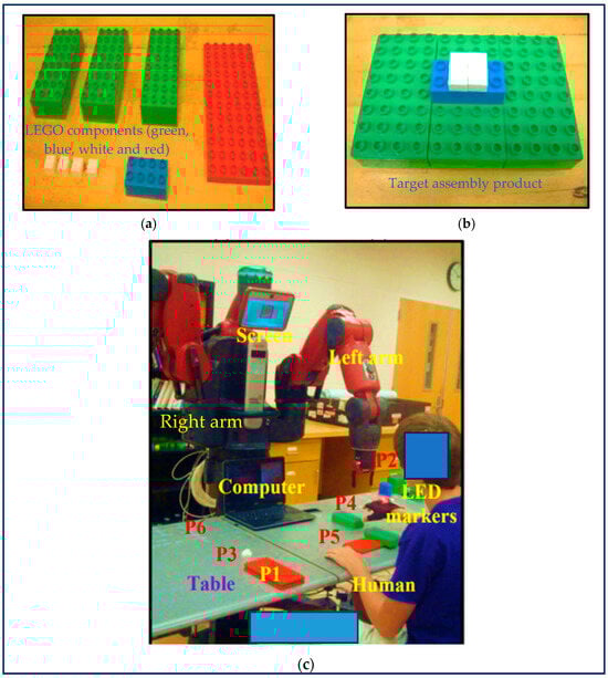 (a) LEGO components (parts), (b) the target product to be produced through assembling the LEGO components (the red component is not shown as it was covered by the green components) by the human and the robot in collaboration, and (c) the human–robot hybrid cell for performing the assembly of the product. The human wore a LED glove for the acquisition of data of human hand movements during the assembly process necessary for trust computation in real time [,].