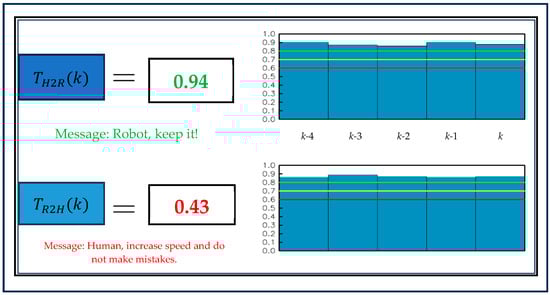 The computed values of bidirectional trust ( and ) were communicated to the human displaying the values on the screen attached at the head of the robot or on the computer (screen) used to control the robot placing it in front of the human []. Figure 3 shows the layout of the trust display (computer) screen. The computed trust values were updated in every time step, k. The screen displayed the computed trust values for 5 recent consecutive time steps exhibiting the trend of the computed trust. The colored lines (red, yellow, green) corresponding to different ranges of computed trust were used as the baselines (thresholds) for developing and communicating warning messages to the human by the computer (cyber) system to inform the trust status and help the human take necessary actions to uphold and maintain the robot trust in the human to a desired level [].