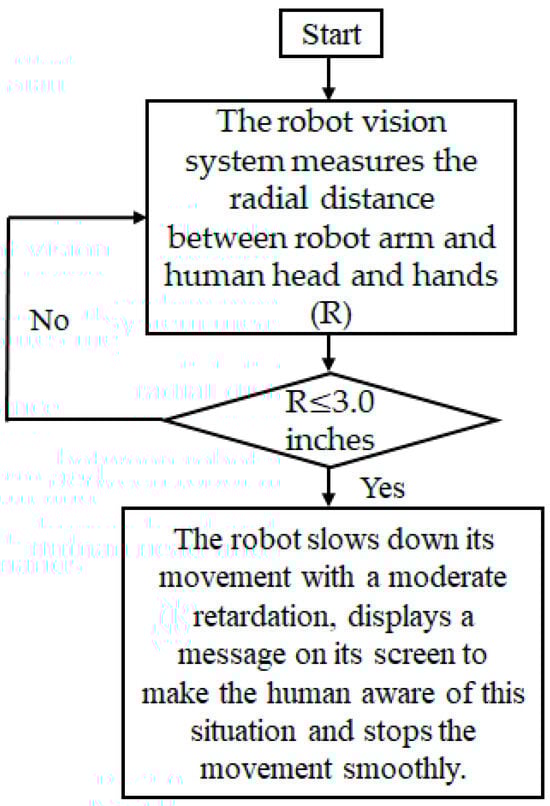 Experiment 2 (modulating communications between the human system and the physical (robot) system): The human observed the manipulation tasks performed by the robot, and the human rated his/her trust in the robot via the keyboard. Thus, the human had visual communication with the robot. Similarly, the robot used its vision system to observe the human collaborating with it []. Based on a safety algorithm, as in Figure 5, the robot slowed down its motion or stopped its motion if the human’s head, hands, or body parts came very close to the robot’s arm [,]. The robot also displayed such events as messages on its monitor (screen) attached to its head. As a result, the robot communicated potential safety hazards to the human co-worker []. We adopted two experiment protocols as follows regarding this situation: