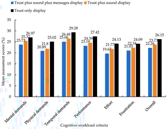 We see that similar trends of results were obtained for the pHRI evaluation results in Table 4 and the cHRI evaluation results in Table 5, where the digits in the parentheses indicate the standard deviations. In Table 5, the mean values of the overall or total cognitive workloads for different experiment protocols are shown. Figure 6 elaborately presents the mean values of different elements (criteria) of cognitive workloads among different experimental protocols (different communication strategies). The reasons behind the similar trends of results might be that the additional auditory and visual cues in communications helped humans become more engaged in the collaboration with the robot through the CPH framework [,]. The enhanced transparency through the auditory and visual cues made the collaboration fluent []. As a result, the pHRIs increased. The advanced auditory and visual cues in communications created a transparent and fluent environment that helped the humans perform the collaborative task with reduced cognitive requirements, which reduced the cognitive workloads []. The enhanced transparency due to additional cues made humans aware of the work environment, which enhanced situation awareness []. The overall improvement in the task performance and interaction scenarios enhanced the human’s trust in his/her collaborator (the robot) and in the collaboration environment (CPH system) [].