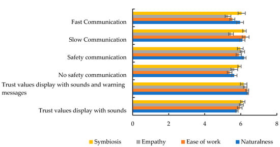 Table 6 shows the mean assembly completion times and mean assembly success rates for the two experimental conditions (safety communications versus no safety communications) related to modulating communications between the human system and the physical system []. In the table, the digits in the parentheses indicate the standard deviations. The results show that the mean assembly completion time is lower (efficiency is higher) when the safety algorithm is not in effect and no safety hazards are communicated to the human co-worker by the robot (physical system) []. This might happen because the robotic system does not need to check safety hazards and inform the human of the safety related warnings for the no-safety-communications condition. The human tried to keep pace with the robot for the assembly task. As a result, the assembly completion time decreased, and the (time) efficiency of the assembly task increased for the no safety communications condition. However, the assembly success rate was lower for the no-safety-communication condition compared to when the safety communication was in effect. This might happen because the human might be fearful to work with the robot when no safety communication is conveyed to the human. The human performed the assembly task keeping pace with the robot’s movement, which decreased the task completion time, but the fear of possible hits by the robot on the human’s body parts while performing the assembly task might have adversely affected the assembly success rate. The opposite happened when safety communication was in effect, which significantly increased the assembly success rate [].