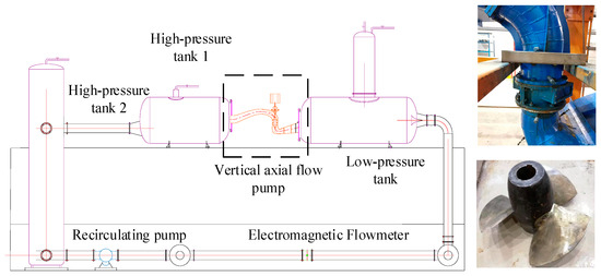 To verify the suitability of the numerical simulation boundary conditions and the accuracy of the calculation results, an external characteristic test of the vertical axial flow pump was conducted. The test setup is illustrated in Figure 1. The test bench is a closed vertical structure, divided into upper and lower layers. The flow rate is measured using a German KOLONG intelligent electromagnetic flowmeter, positioned in the lower layer to prevent cavitation in the working medium from affecting the measurement accuracy of the inlet pressure. The measurement uncertainty of the flowmeter is 0.2%. The head and input power are measured using a Japan Yokogawa EJA intelligent differential pressure transmitter and a China JCL2/500Nm intelligent torque-speed sensor, respectively. These instruments are located in the upper layer, with measurement uncertainties of less than 0.1% for both head and input power. This setup ensures high-precision measurements and reliable validation of the numerical simulation results.