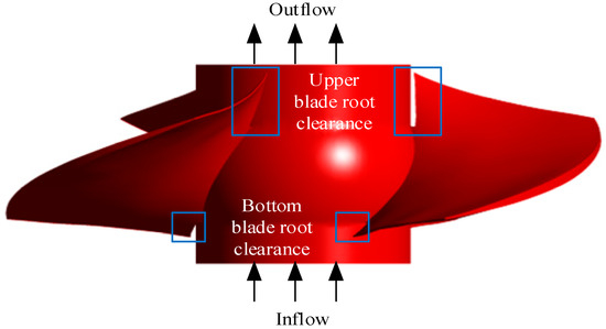 In this study, the vertical axial flow pump system comprises an inflow channel, impeller, guide vanes, and an outflow channel, as illustrated in Figure 2. To investigate the influence of root clearance on the internal flow structure and pressure pulsation, three blade root clearance δ were designed, 2.7 mm, 5 mm, and 8 mm, as shown in Figure 3. The primary geometric and hydraulic design parameters are as follows: the impeller diameter is 300 mm, the blade tip clearance is 0.3 mm, the number of blades is 3, the impeller hub diameter is 120 mm, and the number of guide vanes is 6. The design flow rate Qdes is 0.308 m3/s, the design head H is 4.3 m, and the design efficiency is 77.3%. The rotational speed n is set at 1340 rpm.