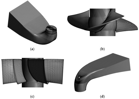 Computational mesh of domain components: (a) inflow channel, (b) impeller, (c) guide vanes, and (d) outflow channel.