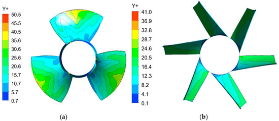 The distribution of Y+ values for (a) impeller and (b) guide vanes.