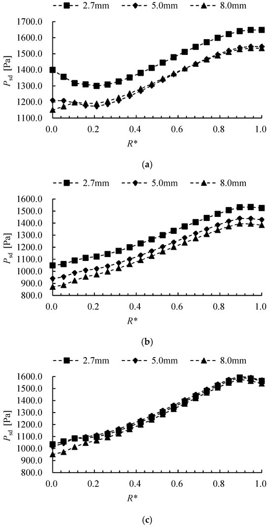 Radial distribution of Psd at impeller outlet with S* = 0.96 under (a) 0.8Qdes, (b) 1.0Qdes, and (c) 1.2Qdes.