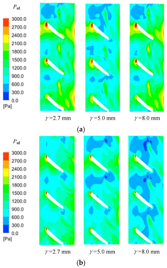 To characterize blade root clearance δ’s influence on pressure pulsation intensity along the impeller outflow path, Figure 10 displays the cylindrical section at radial coefficient R* = 0.01, while Figure 11 shows the cylindrical expansion of pressure pulsation intensity inside the impeller passage under three flow conditions. Distinct high-intensity zones emerge at blade leading edges—attributed to inflow-blade impact—and near the impeller outlet due to rotor–stator interaction with guide vanes. Concurrently, extensive low-intensity regions develop within blade channels from leakage-flow-induced vortex structures. These vortex-dominated regions exhibit clearance-dependent behavior: under low flow, the low-intensity area first expands, then contracts with increasing δ; at design flow, it expands progressively with δ; high flow conditions show minimal δ sensitivity. This non-uniform area response demonstrates that δ enlargement variably modulates leakage vortex coherence rather than exerting a consistent influence. Consequently, outflow field modifications must be integrated into blade root clearance optimization protocols.