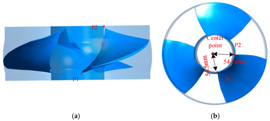 Locations of pressure pulsation monitoring points within the impeller: (a) front view and (b) top view.