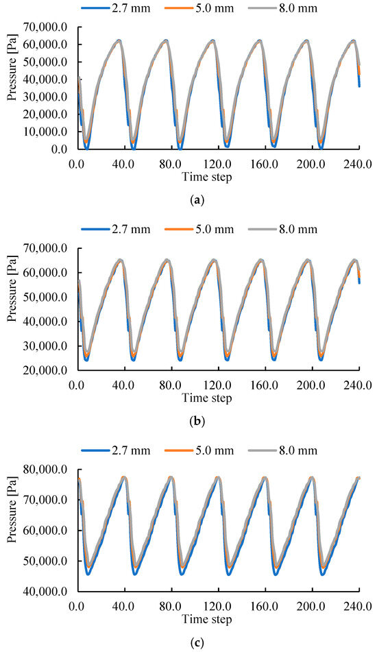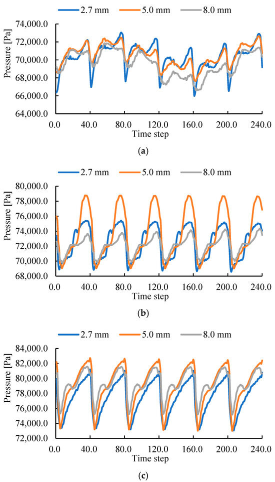 Time diagram of pressure pulsation at monitor P2 under (a) 0.8Qdes, (b) 1.0Qdes, and (c) 1.2Qdes.